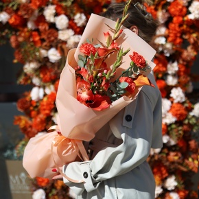 Букет "На закате дня" из гладиолусов, калл, гиперикума и диантусов