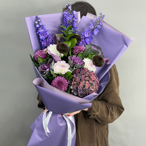 Букет "Лунное затмение" из Голландской гортензии, брассики, георгин, калл, дельфиниума, гербер Экзотик и хризантем Момоко