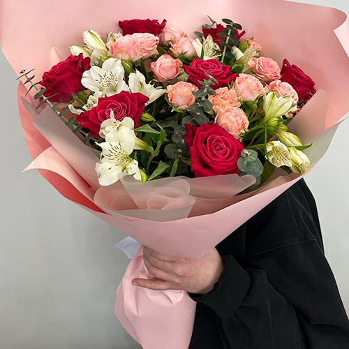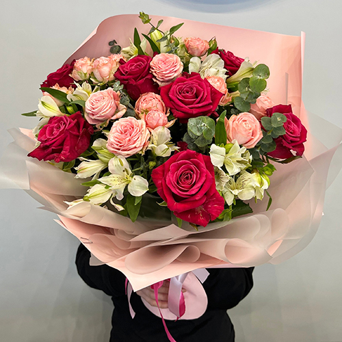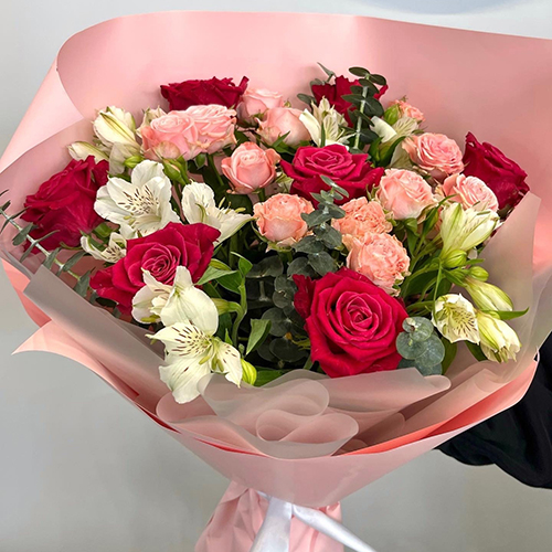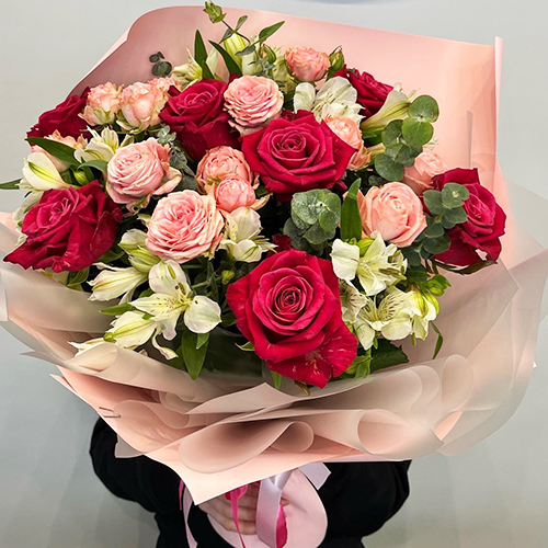 Букет "Ариель" из малиновых роз Шангрила, кустовых пионовидных роз Бомбастик и альстромерий